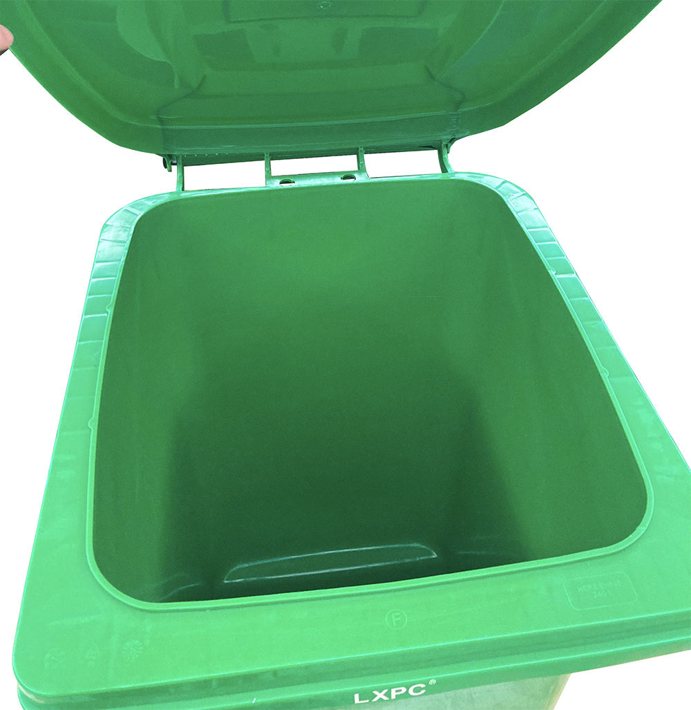 High-quality 240 litre plastic outdoor wheelie bin with sturdy wheels and standing design, perfect for commercial and residential waste management.
